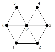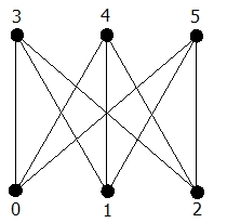 | Die Anwendung der beiden Funktionen soll an zwei Beispielen erläutert werden: | Graph G(7): Abb.: Graph G(7)Ein solcher Graph kann mittels constructG(n) für allgemeine n erzeugt werden. Die Prozedur constructG(int n) erwartet eine ganze Zahl n > 3. Sie konstruiert einen Graph mit n Knoten, in dem die Knoten 1 bis n zyklisch verkettet sind, und der Knoten 0 mit jedem dieser Knoten verbunden ist. Als Rückgabe hat sie den entsprechenden Graphen G(n) in Form einer Nachbarschaftsliste, also vom Typ int *graph Hier lautet die Nachbarschaftsliste entsprechend: 8 14 17 20 23 26 29 32 1 2 3 4 5 6 0 6 2 0 1 3 0 2 4 0 3 5 0 4 6 0 5 1 Bei Aufruf von demoucron(constructG(7)) beispielsweise liefert die Prozedur als Rückgabewert 1, da der Graph planar ist. Bei Aufruf von demoucron_extd(constructG(7), &faces) mit einem zusätzlichen Parameter vom Typ int *faces werden die Flächen zusätzlich in einem Array mit der Startadresse &faces gespeichert und zwar in der folgenden Form: Das Array hat nach Aufruf von demoucron_extd(constructG(7), &faces) folgende Einträge: 6 5 4 3 2 1 -1 3 2 0 -1 2 0 1 -1 0 6 1 -1 0 5 6 -1 0 4 5 -1 0 3 4 -2 Die einzelnen Flächen sind also durch eine -1 abgetrennt. Eine -2 gibt schließlich das Arrayende an. Graph K(3,3): Abb.: Graph K(3,3)Ein solcher Graph kann mittels constructK(n,m) für allgemeine n erzeugt werden. Die Prozedur constructK(int n, int m) erwartet zwei ganze Zahlen n > 1, m > 1. Sie konstruiert einen Graphen mit n+m-Knoten, in dem die ersten n genau mit den letzten m-Knoten verbunden sind. Als Rückgabe hat sie den entsprechenden Graphen K(n,m) in Form einer Nachbarschaftsliste, also vom Typ int *graph Hier lautet die Nachbarschaftsliste demnach: 7 10 13 16 19 22 25 3 4 5 3 4 5 3 4 5 0 1 2 0 1 2 0 1 2 Bei Aufruf von demoucron(constructK(3,3)) beispielsweise liefert die Prozedur als Rückgabewert 0, da der Graph nicht planar ist. Bei Aufruf von demoucron_extd(constructK(3,3), &faces) wird ebenfalls eine 0 zurückgegeben und das Array mit der Startadresse &faces hat nachher lediglich als einzigen Eintrag: -2 |